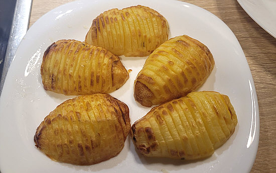 Hasselback-Kartoffeln ... so lecker ... und dabei so einfach ... einschneiden, mit Öl bepinseln, 25 Minuten in die Heißluftfritteuse ... noch ein Tipp: die Kartoffeln halbieren, damit sie schneller gar sind ... was die Größe betrifft, das ist ein Kuchenteller.