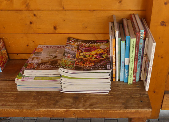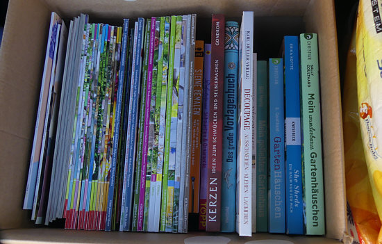 Beate hat aussortiert ... und so haben wir einen ganzen Karton mit Büchern und Zeitschriften in den schönsten öffentlichen Bücherschrank, den wir kennen, gebracht. Der steht in Wittersheim an einer Bushaltestelle ... dort ist viel Platz ... da konnten wir alles wunderbar hinlegen: