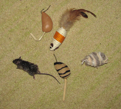 Ich habe auch so eine Sammlung Spielmäuse. Sie wurden alle in den Korb "Nach Hause" versorgt. Gott sei Dank sind hier scheinbar keine Mäuse in der Umgebung, dafür bringt Daisy mir lebende Frösche immer wieder....glg Brigida