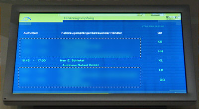 Das erste Auto hatte ich um 16.09 Uhr fotografiert, das letzte um 16.26 Uhr. Immer die Uhr im Hinterkopf ... und immer mal wieder der Blick auf die Anzeigetafel. Ein netter Service von VW zur Erinnerung, dass man sich nicht zwischen den alten Autos verlaufen soll, sondern auch mal zu Potte und zur Neuwagenabholung kommen: