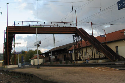 Die Treppe ist so steil, dass Gehbehinderte keine bis kaum eine Chance haben, auf den Bahnsteig in Richtung Homburg zu gelangen. Demnächst soll aber alles besser werden, irgendwelche Gelder fliessen für eine Unterführung der Gleise. Mit Aufzug. Eben noch das behelfsmäßige Minus und bald das Optimale. Mal sehen.