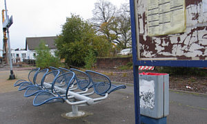 ... daneben ein angekettetes Rad. In der Not kettet man halt am Zaun an. Der Bahnhof selbst besteht aush geschlossenen Türen: