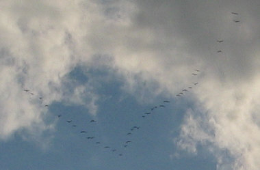 ... hab ich am Himmel gesehen und war wirklich reiner Zufall, dass ich genau in diesem Moment die Landschaft unter dem Himmel fotografieren wollte. Im Augenwinkel hab ich die Vögel gesehen ... aber rein gar nix gehört. Untypisch, normalerweise hört man Kraniche auch gegen den Wind. Womit die Frage, ob das nun überhaupt Kraniche sind, im Raum steht.