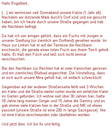 ... sie hätte sich ja zu gerne von uns streicheln lassen, aber so ganz getraut hat sie sich dann doch nicht. Ist aber gar nicht verkehrt, lieber zu vorsichtig als zu vertrauensselig. Kommen ja noch andere außer Beate und Engelbert vorbei.