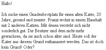 Nein, das ist absolut kein Grund ... vielleicht findet sich ja ein Platz, was ich sehr hoffe. Der Kater ist in Lörrach und wird bis zu 200 km zum neuen Halter gebracht.