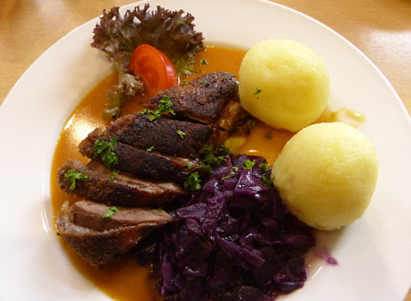 Auf jeden Fall war das Essen eher "na ja" ... die Suppe sehr unauffällig, die Gans außen salzig, innen trocken, die Knödel auf keinen Fall selbst gemacht, das Rotkraut hatte einen bittern Nelkengeschmack, die Soße hatte mit Orangen nix zu tun. Beim Nachtisch war Eis und Schokosoße zu süß, die Kirschen zu sauer und insgesamt wars zu schwer und zu üppig.