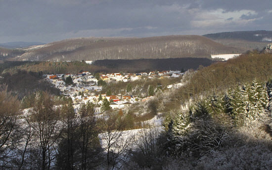 Das könnte Tholey sein, aber ich bin mir da nicht sicher. Viele Menschen liefen auch unseren Weg ... wir mussten oft stehen blieben, weil durch den Schnee überholen oder vorbeigehen nur möglich war, wenn einer sich an den Rand des Weges stellte und wartete.