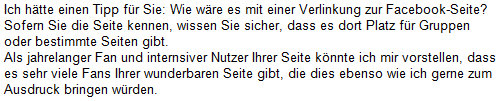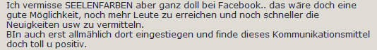 Seelenfarben wäre dort nur, um zu sagen, dass die Weihnachtskarten online sind, es neue Desktopmotive gibt, sich das heutige Kalenderblatt lohnt ... es wäre eine reine Werbesache ... die Seelenfarben-Inhalte wirds immer nur auf Seelenfarben direkt geben ... wer also nur dort und nicht bei Facebook ist, der wird nichts verpassen. Um aber gerade jüngere Leser zusätzlich für Seelenfarben zu interessieren, mag es sinnvoll sein, dort seine Webseite zu präsentieren.