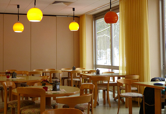 Damit Ihr Euch mal ein Bild machen könnt ... wenn wir ab und zu in der Krankenhaus-Cafeteria zu Mittag essen, dann meine ich diesen Raum ... rechts überm Stuhl hängt meine Winterjacke, dort haben wir heute gesessen und es gab Tagliatelle mit Lachs. Und Maiscremesuppe. Und Marmorkuchen.