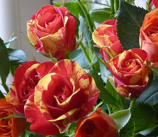 Eine wunderschöne, kleinblütige, mehrfarbige Rosensorte, die ich da im Aldi gesehen, gekauft und Beate auf die Fensterbank gestellt habe.