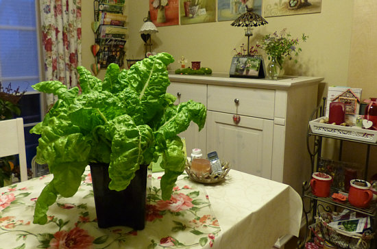 Der neue Tischschmuck: Mangold aus dem eigenen Gewächshaus ... den wird es morgen oder übermorgen geben ... wie wir ihn zubereiten, dass müssen wir noch sehen, suchen, nachlesen ... kann man wie Spinat machen, aber mal sehen, was aus diesem Gold wird.