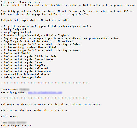 Zur Info: der Link in der Mail führt zwar auf die Seite des Links, aber wenn man dann weiterklickt, landet man auf wellnesstuerkei.net ... und nun lasse ich meine Leser mal über die Seriosität dieser Mail und dieses Anbieters spekulieren.
