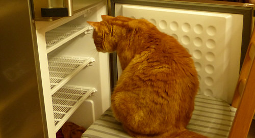 ... schaut voller Verzweiflung in den leeren Gefrierschrank, den ich gerade am Abtauen bin. Mogli ...