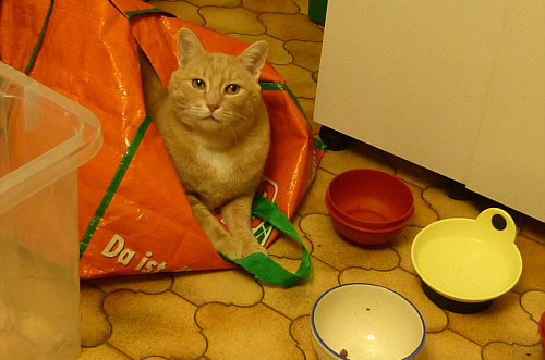 ... sitzt genauso verzweifelt in einer Tasche neben den leeren Futternäpfen. Nicht nur, dass sie um kurz vor 22 Uhr immer noch nix zu essen haben (normalerweise gibts gegen 19 Uhr, aber heute war keine Zeit) sondern das Herrchen bloggt auch zuerst noch über das Hungerleid und erst danach gibts Futter ... würden die beiden Tagebuch schreiben, stünde heute "Gefrierschrank abtauen ist dooof" drin ;)).