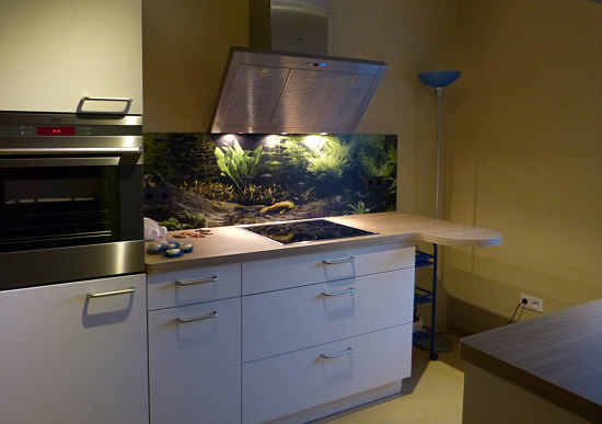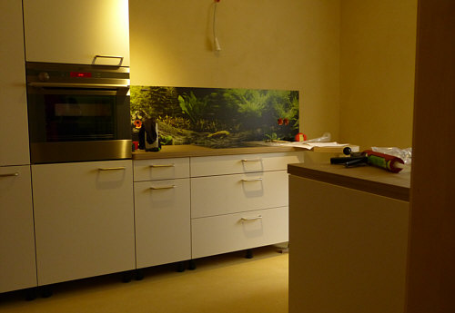 Das Bunte ist eine Rückwand (Aluminiumverbundplatte mit einer uv-stabilen Schutzschicht, die im Digitaldruckverfahren bedruckt wurde), als Spritzschutz für die eigentliche Wand, das kleine Rote im Bunten sind keine Fische, sondern Steckdosenaussparungen, da kommen noch farblich passende Steckdosen hin.