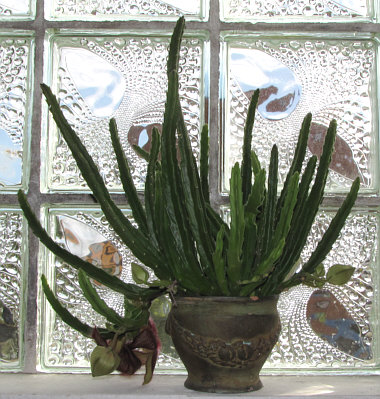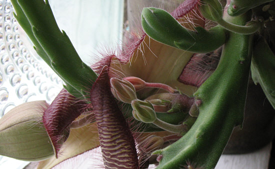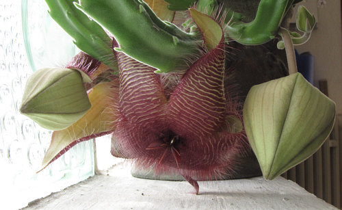 ... sieht man sehr schön eine geöffnete Blüte und zwei Knospen. Auch da ist nichts stachelig, der tut nur so hart, ist aber weich. Mehr Infos im Wikipedia-Artikel Aasblume.