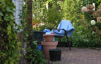 ... steht da so rum. Mit Decke. Weil sich vielleicht Blacky drauf setzen will. Oder ich (und dabei Blacky haltend). Er steht halt da, falls jemand das Bedürfnis hat, im Freien auf einer blauen Decke zu sitzen.