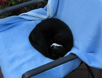 Hmm ... irgendwie will das Weiß nicht zu unserer Oma oder unserem Senior passen. Wer mag da liegen ?? Es ist Felix, ein Kater aus der Nachbarschaft, der das freundlichweichwarme Blau zu schätzen weiß.
