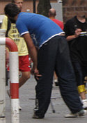 ... dasselbe in blau. Ebenfalls jung, zwischen 30-40. Die gleiche Art der Fortbewegung ... die in diesem Fall direkt ins McDonald führte, um dort visuell an das schlechte Gewissen der Gäste zu appellieren, denn wie kann man essen und nix geben, wenns jemanden so schlecht geht.