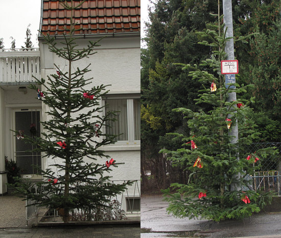 So sehen die Bäume aus, die in unserem Ort entlang der Hauptstraße an ca. jedem 3. Straßenlampenposten (oder auch mal am Zaun) stehen. Und ich überlege gerade, ob das jetzt eine schöne Geste der Gemeinde ist oder ob man bedauern sollte, dass deswegen so einige Bäume ihr Leben lassen mussten. Die Bäume sind eine nette Geste, aber nicht wirklich dekorativ ... das kann nur ein Baum mit Licht sein.