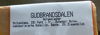 Gudbrandsdalen heißt das Tal, aus dem der Käse kommt, Gudbrandsdalsost heißt der Käse genau und er wird ähnlich wie der von Steffi genannte Ekte Geitost hergestellt. Der Ekte ist aus Ziegenmilch, während mein Käse hauptsächlich aus Kuhmilch ist.