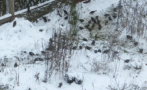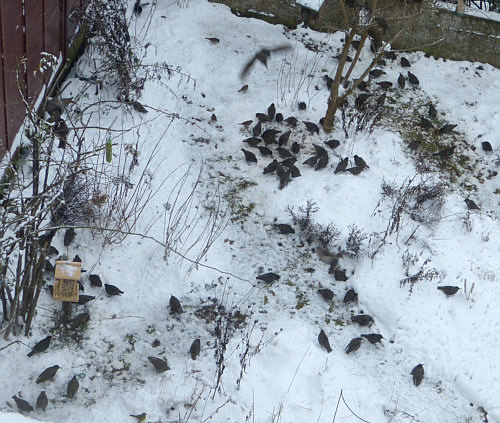 Ich würde die nicht füttern ... aber Beate sagt "es wird niemand ausgegrenzt ... wenn ich Spatzen, Meisen etc. füttere, kann ich die Stare nicht hungern lassen ... bei mir bekommen alle etwas, es kommt keiner zu kurz" und "es gibt sonstwo immer weniger zu essen für die Vögel, weil es immer weniger Gärten gibt und immer mehr Steine und kaum jemand die Vögel füttert" ... und so sind halt die wenigen guten Futterquellen immer besser besucht. Außerdem füttert Beate gutes handgemachtes Futter und nicht die oft bescheidene Qualität, die im Handel angeboten wird.