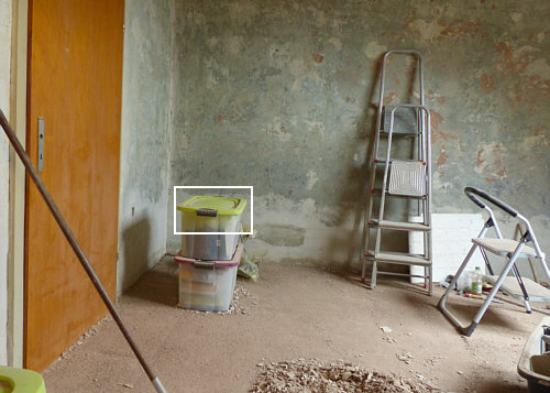 ... sieht die Decke in meinem Wohnzimmer aus, wenn die Styropor-Deckenplatten entfernt sind und der Deckenputz abgeklopft wurde.