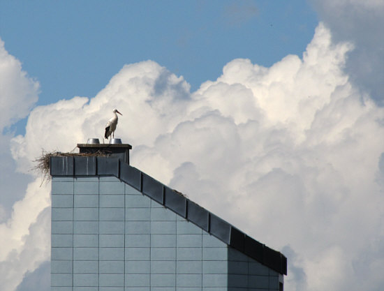 Storchennest und Storch in Miesau (auf dem Dach des Feuerwehrhauses)