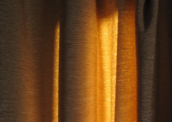 Die Abendsonne scheint auf meinen Chenille-Vorhang zwischen Wohnzimmer und Küche.