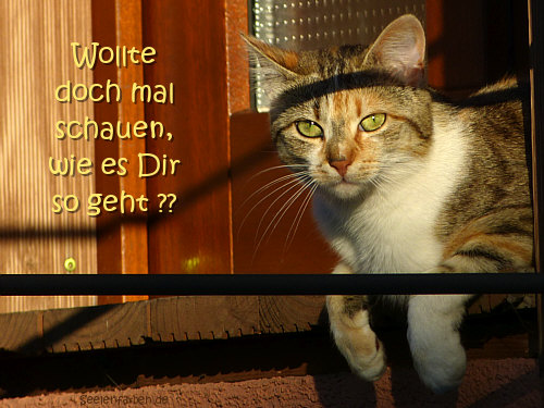 Ideal, um an Menschen, mit denen man schon länger keinen Kontakt mehr hatte, zu schicken. Natürlich kann man die Karte auch an gute Freunde schicken, von denen will man ja öfter wissen, wie es ihnen geht. Das Motiv ist ganz frisch, das hab ich vor 3 Tagen fotografiert (Spaziergangskatze).