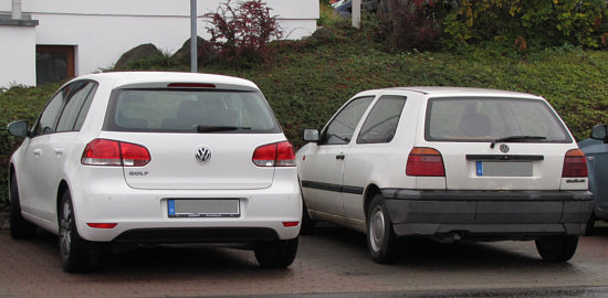 Heute auf dem Penny-Parkplatz fotografiert ... zweimal VW Golf ... einmal Generation 3 und einmal Generation 6 ... hier kann man wunderbar sehen, wie der Golf immer größer und höher geworden ist ... das ist mittlerweile ne ganz andere Autoklasse geworden.