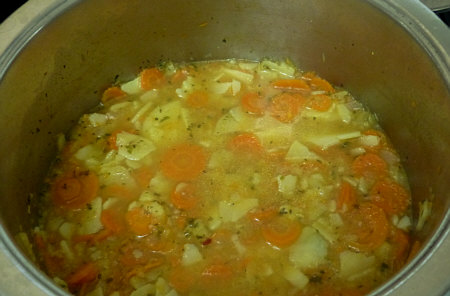 In einem anderen Topf ebenfalls dünn geschnittene Kartoffeln kochen ... ich mach das immer im separaten Topf, weil ich so besser kontrollieren kann, wann die Kartoffeln weich sind, unabhängig davon ob die Karotten es auch schon sind. Außerdem hab ich mit der Kartoffelkochbrühe Flüssigkeit zur Verlängerung zur Verfügung.