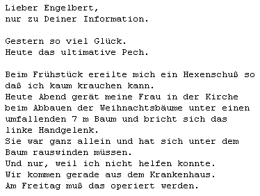 Mögen wir alle von solchen "Überraschungen" oder "Verkettungen unglücklicher Umstände" verschont bleibt. In diesem Fall hat ein Unglück ein anderes nach sich gezogen ... dabei hätte eines schon gereicht. Menno ... gute Besserung.