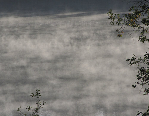das Schöne des Tages: dampfender See am Morgen
