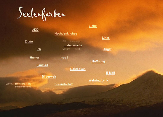 Damals noch mit Word gemacht. In diesem Oktober gab mir dann jemand den Tipp, es doch mal mit Frontpage zu versuchen. "Das kann ich nicht, das lerne ich nie" war meine Antwort ... aber dann hatte mir die Jana geduldig meine Fragen beantwortet und ab November 2000 wurde Seelenfarben mit Frontpage gestaltet. Was bis heute auch so geblieben ist.