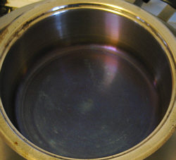 sieht ein AMC-Topf aus, wenn er eine halbe Stunde leer auf großer Gasflamme gestanden hat. Wollemer mal schauen, ob wir den wieder kalt und silber kriegen.