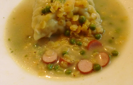 Maultasche in Brühe mit gelben Linsen, Erbsen und Würstchenscheiben.