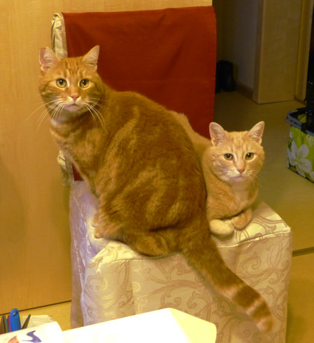 Zwei Katzen auf einem Stuhl ... das geht nur, wenn Herrchen Katze eins vom Tisch jagt, weil er gerade am Fotografieren ist, sonst keine Sitzgelegenheit frei ist und der Kater seinen ausgehungerten Körper allen Anwohnern des Hauses zeigen muss, weil er gleich vom Fleisch fällt.