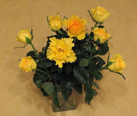 Diesen Strauß hatte ich gekauft, weil da vorne die eine Rose, die schon ein wenig erblüht war, so andere Blütenblätter hatte.