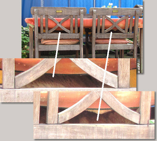 Auf den ersten Blick sieht es so aus, dass auf den Stühlen am Tisch niemand sitzt ... auf den zweiten Blick sind sie aber beide belegt ... mit M und M. Warum dieses Versteck ? Ist keines ... dort unterm Tisch auf den Stühlen ist es weich ... und ... trocken. Denn kurz vorher hatte es geregnet und unsere Kater legen sich nun doch nicht ins nasse Gras, sondern haben höhere Ansprüche ;)).