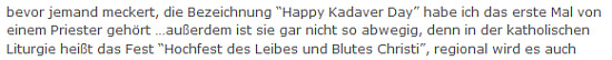Vielleicht wurde dieser Ausdruck auch von norddeutschen Menschen erfunden, die gerne Feiertag gehabt hätte, aber leider Pech hatten und so den Süddeutschen, die eben Feiertag hatte, sarkastich "Happy Kadaver Day" gewünscht haben.