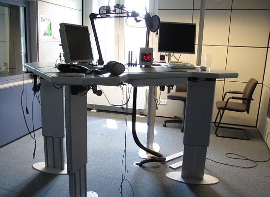 Wir waren heute im SWR in Kaiserslautern, weil wir uns die dort hängenden Bilder eines Malers anschauen wollten ... und dann ergab es sich (bzw. meine Neugier öffnete mir die Tür), dass ich einen Blick ins Studio werfen und auch fotografieren durfte ... hier spricht gerade Jochen Voß die Nachrichten zur Probe. Viel mehr als Nachrichten und eine Stunde Mittagssendung werden von Kaiserslautern aus nicht gesendet, aber der Blick hinter die Kulissen war mal sehr interessant.