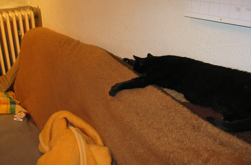 Die Decke existiert heute noch, die Couch steht auch noch ... das kleine rot-weiße Etwas ist längst Vergangenheit und das größere langgestreckte Schwarze mit Beinen leider Erinnerung. Blacky wäre inzwischen 18 Jahre alt.