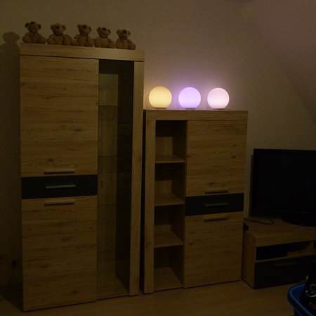 Die Lampen ... da steht die Farbe fest und ändert sich nicht. Es werden immer wieder andere Farben sein, aber ich lasse die Lampen nicht in Dauerschleife die Farbe ändern ... ich suche mir welche aus und die bleiben dann an dem Tag. Wobei ich ja vorläufig eh nicht in dem Zimmer zu finden bin.