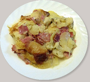 Das ist übrigens Blumenkohl-Kartoffelauflauf mit Putenschinken und Käse.