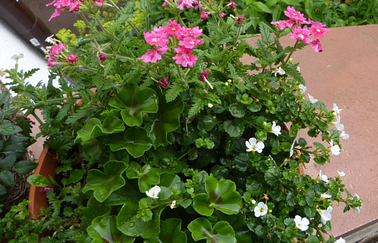 ... dient zum Zeigen der Größenverhältnisse ... das ist eine Pflanzschale vor unserer Haustüre ... oben sehen wir Verbenen ... unten sind so kleine weiße Blümchen, einen Zentimeter groß ... wenn ich da nah ran gehe, sieht das so aus:
