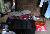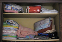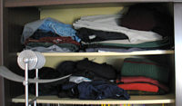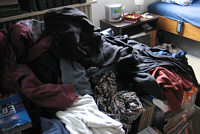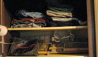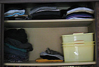 Eben noch Bettwäsche, nun T-Shirts und Pullover. Und die drei Kisten ... das war so ein fahrbares Ding, das ich ganz aus dem Zimmer geschmissen habe. Nun steht es in der Küche *gg*. In den Kisten sind Strümpfe und Unterwäsche, ist aber noch nicht die Endlösung.