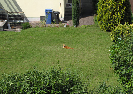 Mickey auf Nachbars Rasen ... vom Badfenster aus über die Hecke fotografiert.