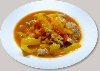 Gefüllte Paprika (hier bereits klein geschnitten) in Tomatensoße ... normalerweise gäbs da Reis dazu, aber es waren noch Kartoffeln da, die wir nicht mehr länger liegen lassen wollten, weil sie sonst zu keimen begonnen hätten.