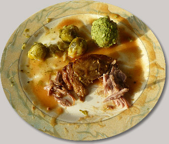 Manchmal ist der Teller irgendwie schon halb leer, bevor man dran denkt, dass man ihn fotografieren könnte ;) ... wir sehen noch Reste Gänsekeule, Rosenkohl und der letzte von zwei Knödeln.